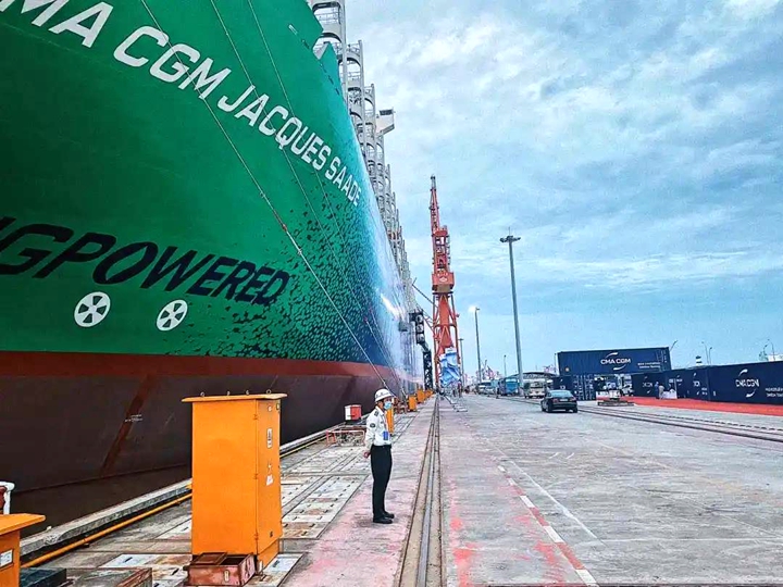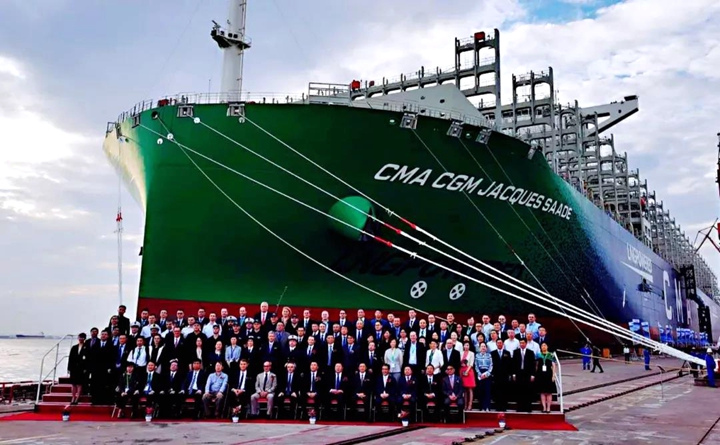 9月22日,中國船舶集團有限公司旗下滬東中華造船(集團)有限公司和中國船舶工業(yè)貿易有限公司作為聯(lián)合賣方,為世界著名航運公司——法國達飛集團建造的世界首艘23000TEU雙燃料動力集裝箱船“達飛雅克·薩德”號,在上海長興島造船基地命名交付。