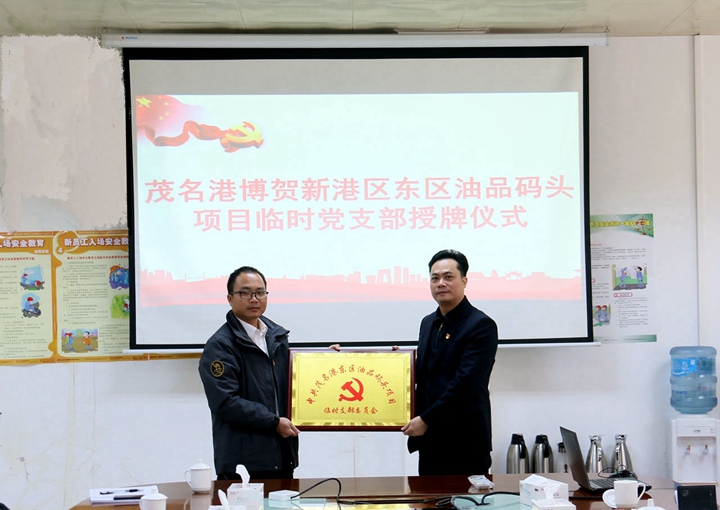 12月18日上午,茂名港集團(tuán)牽頭舉行博賀新港區(qū)東區(qū)油品碼頭項(xiàng)目工程臨時(shí)黨支部授牌儀式,集團(tuán)黨委副書記、工會(huì)主席肖炳璋為臨時(shí)黨支部授牌。臨時(shí)黨支部書記梁祖釗作表態(tài)發(fā)言并鄭重作出承諾。