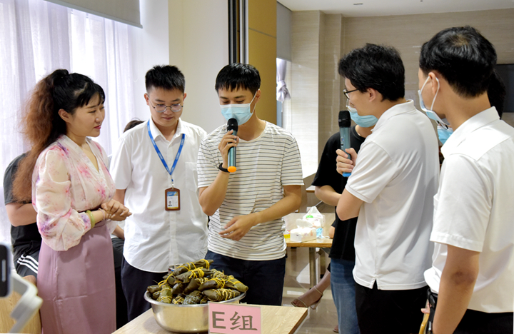 包粽子比賽通過人員交叉搭配進(jìn)行分組比賽。在嫻熟的“老手”作現(xiàn)場(chǎng)示范講解后,各組隊(duì)員紛紛動(dòng)手上陣。只見組員之間分工合作、相互配合,折粽葉、裝糯米、放餡料、裹扎繩……大家紛紛拿出自己的“拿手絕活”。30分鐘的比賽里洋溢著歡聲笑語,各位選手巧手翻飛,一個(gè)個(gè)形態(tài)各異的粽子瞬間成型。最后,大會(huì)裁判以“速度、質(zhì)量、美觀、衛(wèi)生”為評(píng)判標(biāo)準(zhǔn)對(duì)各組粽子進(jìn)行了評(píng)選。