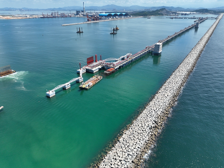茂名港集團(tuán)30萬噸級(jí)原油碼頭工程項(xiàng)目首個(gè)沉箱成功出運(yùn)安裝
