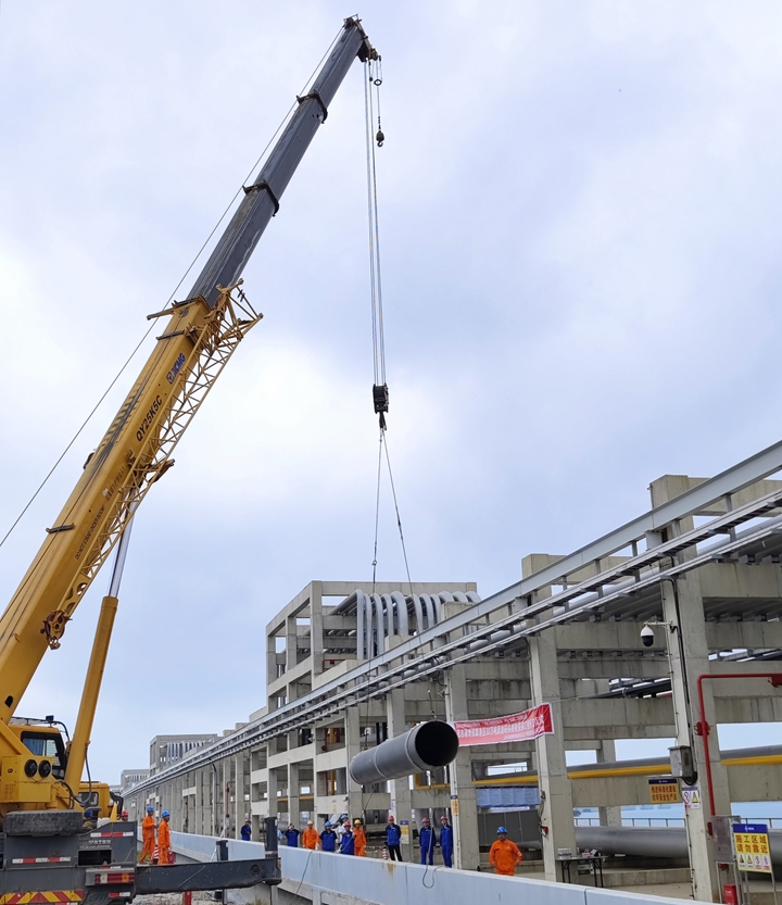 近日,在施工現(xiàn)場(chǎng)吊裝設(shè)備的轟鳴聲和現(xiàn)場(chǎng)工作人員的歡呼聲中,茂名港博賀新港區(qū)30萬(wàn)噸級(jí)原油碼頭工程首根原油管道成功精準(zhǔn)吊裝在陸域公共管廊預(yù)定位置。這是30萬(wàn)噸級(jí)原油碼頭工程項(xiàng)目臨時(shí)黨支部黨建工作與項(xiàng)目建設(shè)深度融合的又一重大突破,不僅標(biāo)志著項(xiàng)目管道安裝工程取得了開(kāi)門(mén)紅,也代表30萬(wàn)噸級(jí)原油碼頭工程建設(shè)邁入機(jī)電工程安裝的新階段。