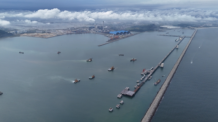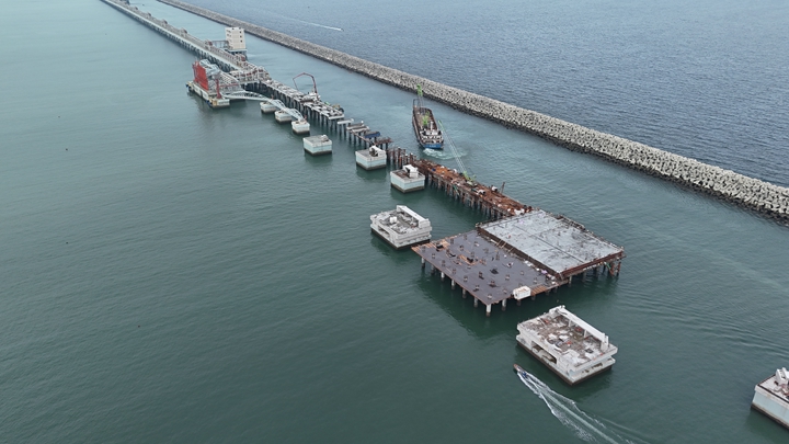 據(jù)悉,30萬噸級(jí)原油碼頭設(shè)計(jì)年吞吐量達(dá)1600萬噸,泊位長度達(dá)404米,碼頭共設(shè)計(jì)有145根樁基,由工作平臺(tái)及工作樓平臺(tái)的70根樁基和附屬管廊橋工程的75根樁基組成,其中工作平臺(tái)及工作樓平臺(tái)的70根樁基已于2023年底全部完工。