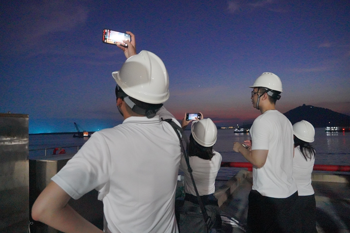 游戲結(jié)束后,大家走進(jìn)了集團(tuán)碼頭庫區(qū)泊位,直觀感受港區(qū)碼頭的宏偉氣勢,親眼目睹了正在建設(shè)的30萬噸級原油碼頭工地忙碌景象,欣賞了港灣的夕陽美景。通過現(xiàn)場參觀,大家對茂名港集團(tuán)的發(fā)展歷程、生產(chǎn)建設(shè)、企業(yè)文化有了更深刻的了解。