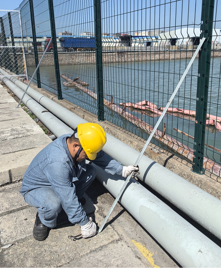 碼頭之間周界圍擋是安全管控的重要屏障,也是港口設(shè)施保安工作重要設(shè)施之一。按外委維修方案,需整體制作圍擋,費用約8萬元。 “能不能自己干?!”黨員維修組現(xiàn)場測量圍擋尺寸,設(shè)計“鋼管立柱+鋼絲網(wǎng)格+防撞條”的簡易圍擋方案,反復(fù)論證可行性后,決定擼起袖子自己干!為確保穩(wěn)固性,黨員維修組用水平儀一米一米測標(biāo)高,用扳手一顆一顆緊螺栓;為防臺風(fēng)天氣傾倒,把鋼管底部焊接在混凝土基座,用水平尺校準(zhǔn)“毫米級”垂直度。5天的連續(xù)作業(yè),為港口經(jīng)營公司周界圍擋起整齊牢固的“安全防線”。