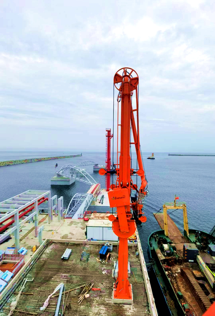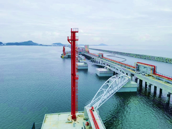 此次安裝的4臺(tái)裝卸臂堪稱(chēng)碼頭“大動(dòng)脈”,每臺(tái)高23.3米、重41.83噸,采用電/液驅(qū)動(dòng)技術(shù),具備高效、安全、穩(wěn)定的輸油能力,全部投用后,每年可助力完成1650萬(wàn)噸原油輸送任務(wù),將大幅提升茂名港原油接卸與中轉(zhuǎn)效率。同步安裝的具有浮動(dòng)功能的登船梯高26.5米、重約32噸,根據(jù)潮汐自動(dòng)調(diào)節(jié)梯高度的智能設(shè)計(jì),為10萬(wàn)到30萬(wàn)噸級(jí)的船舶提供了安全便捷的通道;2座高29米的消防炮塔上的消防水炮最大覆蓋半徑達(dá)99米,其射程遠(yuǎn)、流量大,如同“安全衛(wèi)士”構(gòu)筑起碼頭前沿的安全保障網(wǎng)。